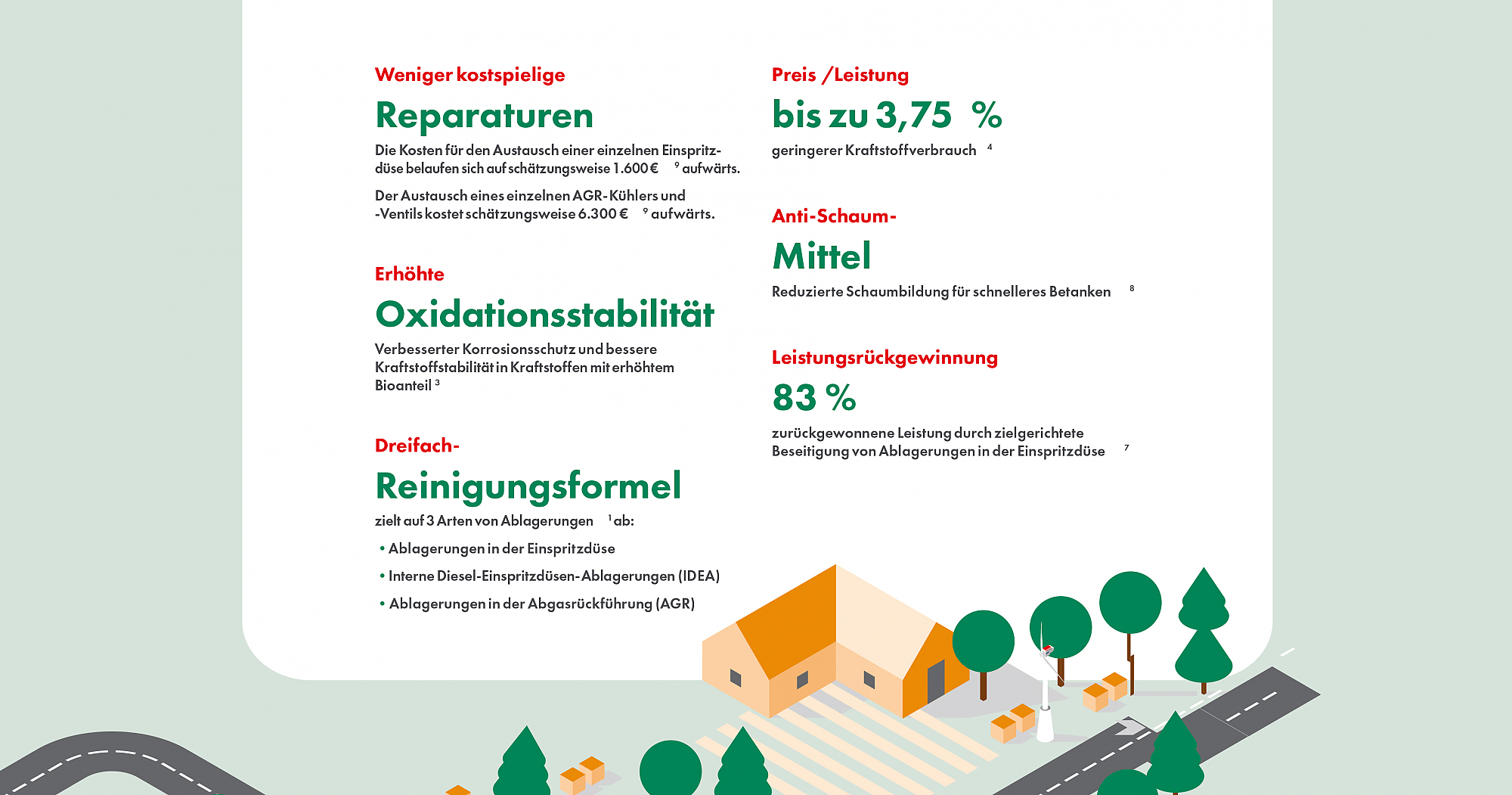 Moderne, immer präziser konstruierte Dieselmotoren sind auf die Minimierung von Ablagerungen an den Einspritzdüsen angewiesen, damit keine Effizienzverluste entstehen. Deshalb nutzt unser NEUES Shell FuelSave Diesel die DYNAFLEX-Technologie3 – unsere neue, exklusive Formel mit zwei Reinigungskomponenten. Sie wurde entwickelt, um die Einspritzdüsen von Ablagerungen zu reinigen und freizuhalten. Dadurch erhöht sich die Kraftstoffeffizienz sowohl neuester als auch älterer Motorengenerationen.